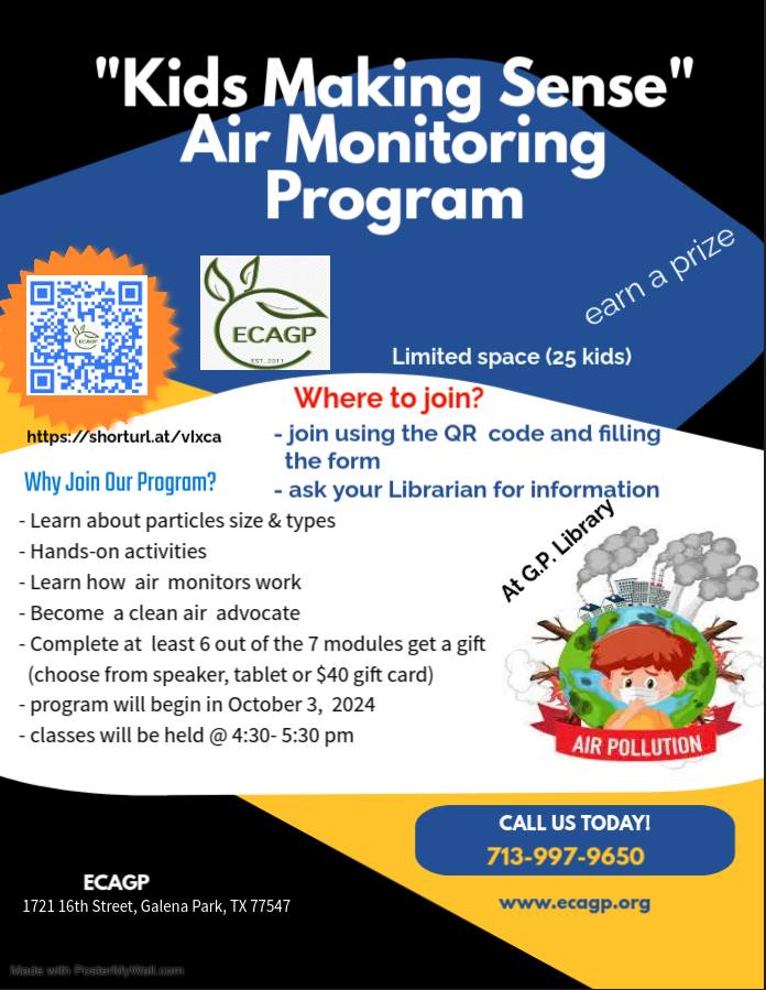 "Kids Making Sense" Air Monitoring Program is back. Starting on October 3, 2024. This program is FREE to kids of all ages. It is offered at the Galena Park Library. It will take place every Thursday for 7 weeks. If interested make sure to register as registration is limited to 25 students.